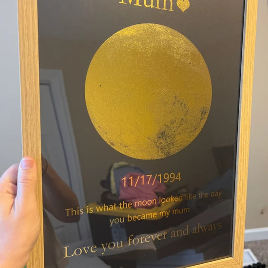 Personoitu kehys "Kuun vaihe" on uniikki lahja, joka vangitsee maagisen hetken kuun vaiheen tarkalla päivämäärällä, olipa kyseessä syntymä, syntymäpäivä tai muu erityinen tilaisuus.