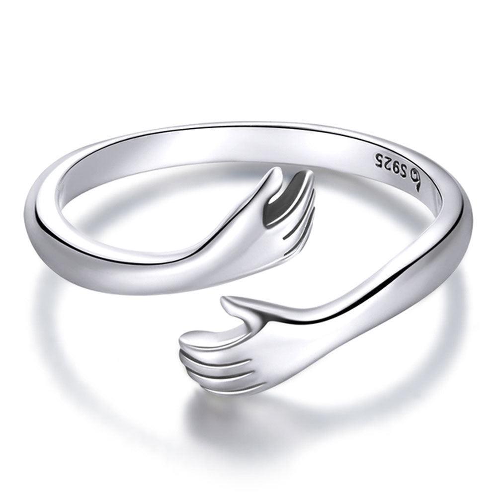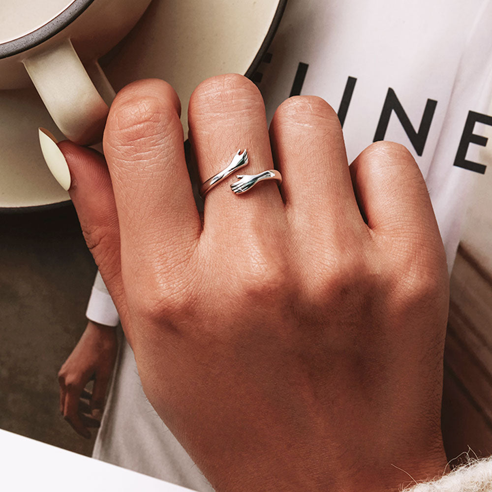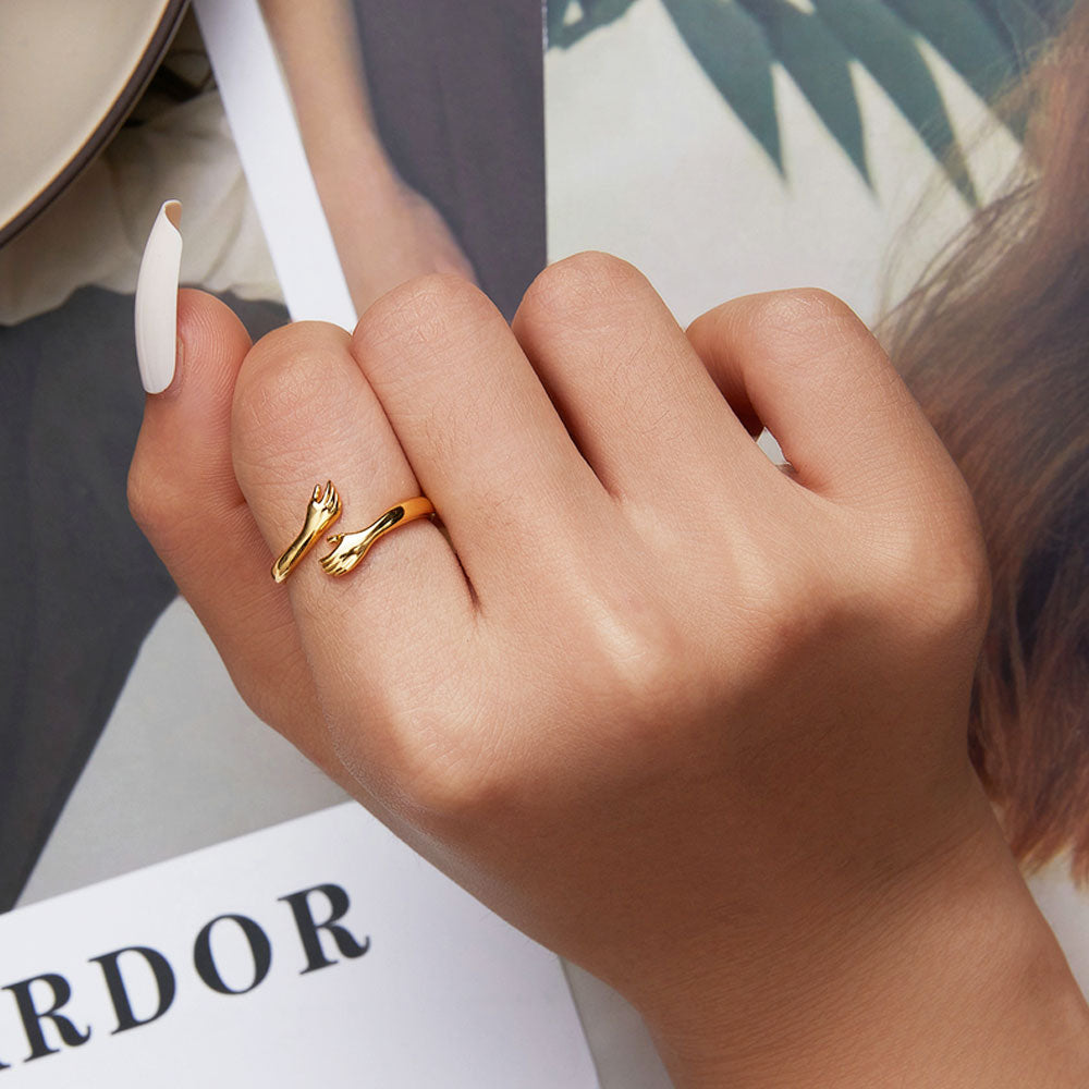 Érezd az örök ölelés melegét ezzel a gyűrűvel. Ez az egyedi darab két kezet ábrázol, amelyek finoman átölelik az ujjadat egy örök ölelés képében. Több mint egy gyűrű, ez a kényelem és a szeretet szimbóluma, amelyet minden nap viselhetsz.